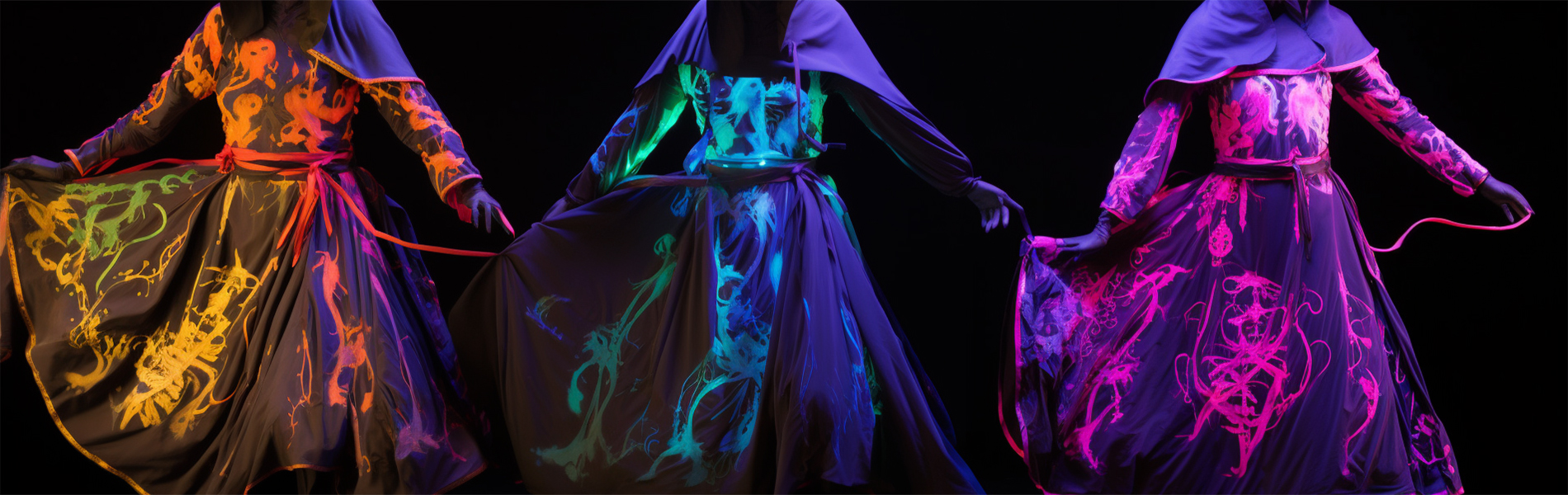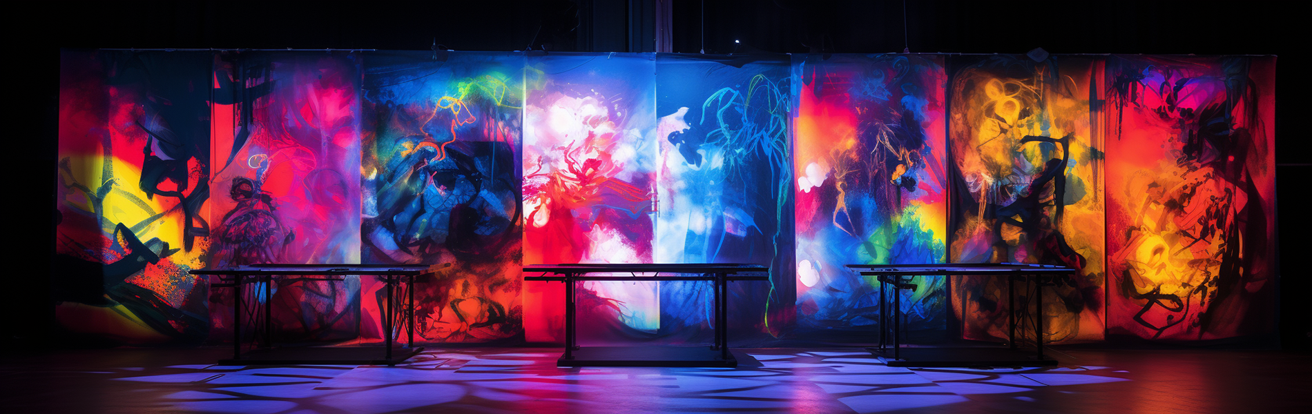 従来のブラックライトアートは何も見えない白い状態の素材に特定の波長帯の紫外線(※365nm~375nm)を照射したときだけ絵や文字が浮かびあがるという仕組みで当社では30数年に渡ってブラックライトアートの制作を行って参りました。ただデメリットとしてブラックライトが点いていない時は単なる白い状態だけのため「見た目が真っ白でさみしい」や「通常の照明の時に白い状態だけで違和感がある」「該当する波長のブラックライトの器具が高価で選定に苦労する」などのご意見が以前からありました。そこで当社では「通常時にもデザインや色が見えてアートとして成立している状態の素材に波長不問のブラックライトを照射すると幻想的に蛍光発光する製品」で「壁紙のように破けることがなく取付簡単な柔らかい生地素材でサイズも例えば高さ180㎝×横幅600㎝というような大きなものでも一枚モノ」の制作を開始しました。