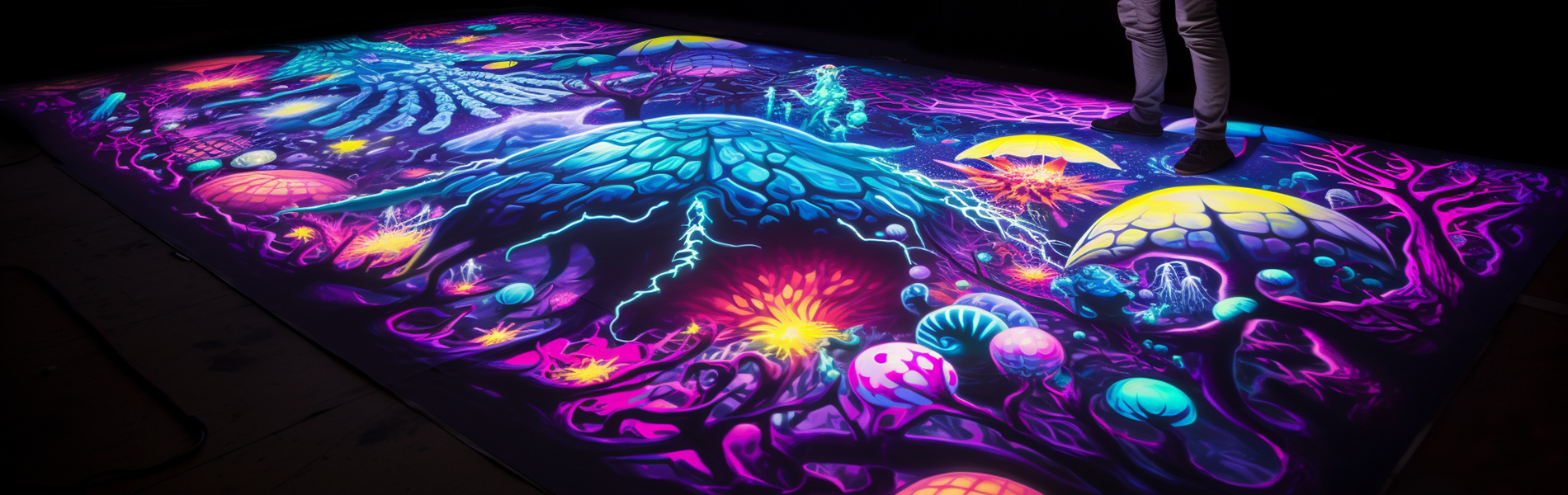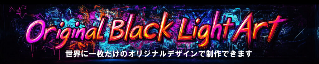 当社で制作するブラックライトアートは安全な紫外線(ブラックライト)に反応する特殊インクで制作しています。デザインデータだけ支給いただくだけであなたのイメージ通りの製品が出来上がります。